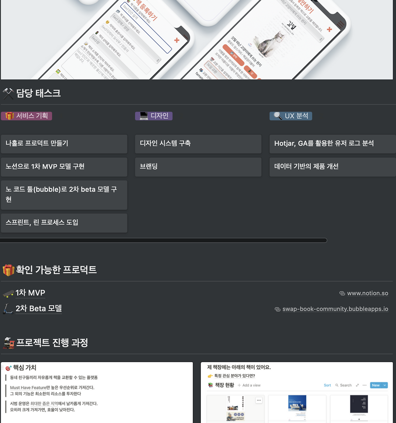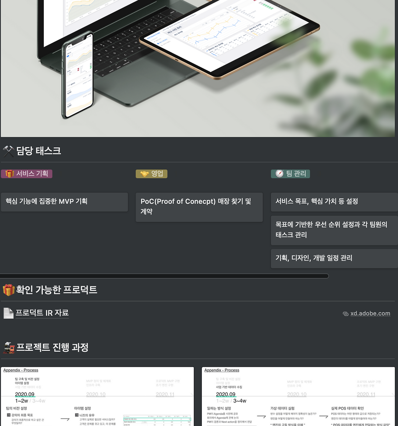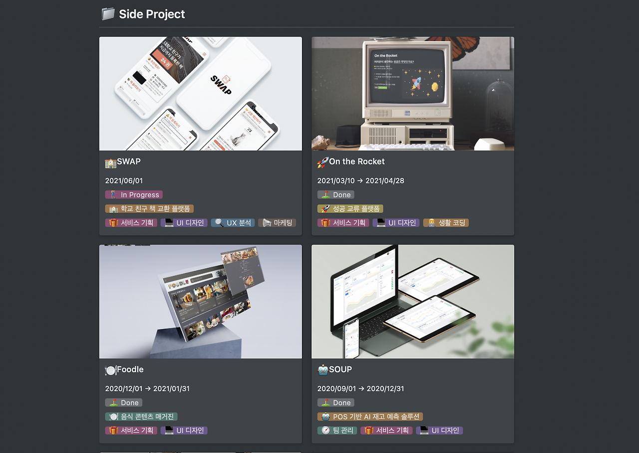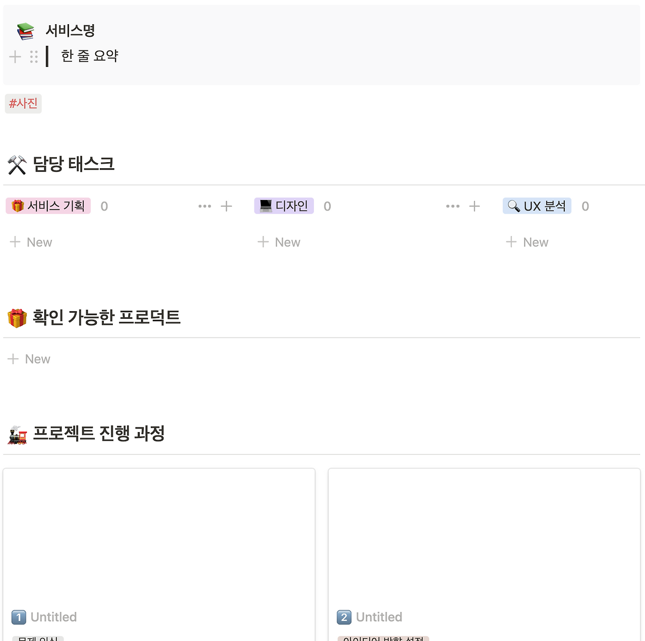 하위 페이지에선 "이 사람은 구체적으로 이런 일을 했구나?"를 전달하는 데 초점을 맞췄다. 이때, 정보를 습득하는 데 부담을 느끼지 않도록, 하위 페이지 형식을 통일성 있게 구성했다. 노션의 템플릿 기능을 이용해, 동일한 종류의 정보는 같은 양식으로 제공했다. 예를 들어, 사이드 프로젝트의 페이지는 [서비스명과 한 줄 요약], [사진], [담당 태스크], [확인 가능한 프로덕트], [프로젝트 진행과정]으로 모두 동일하게 구성됐다.
