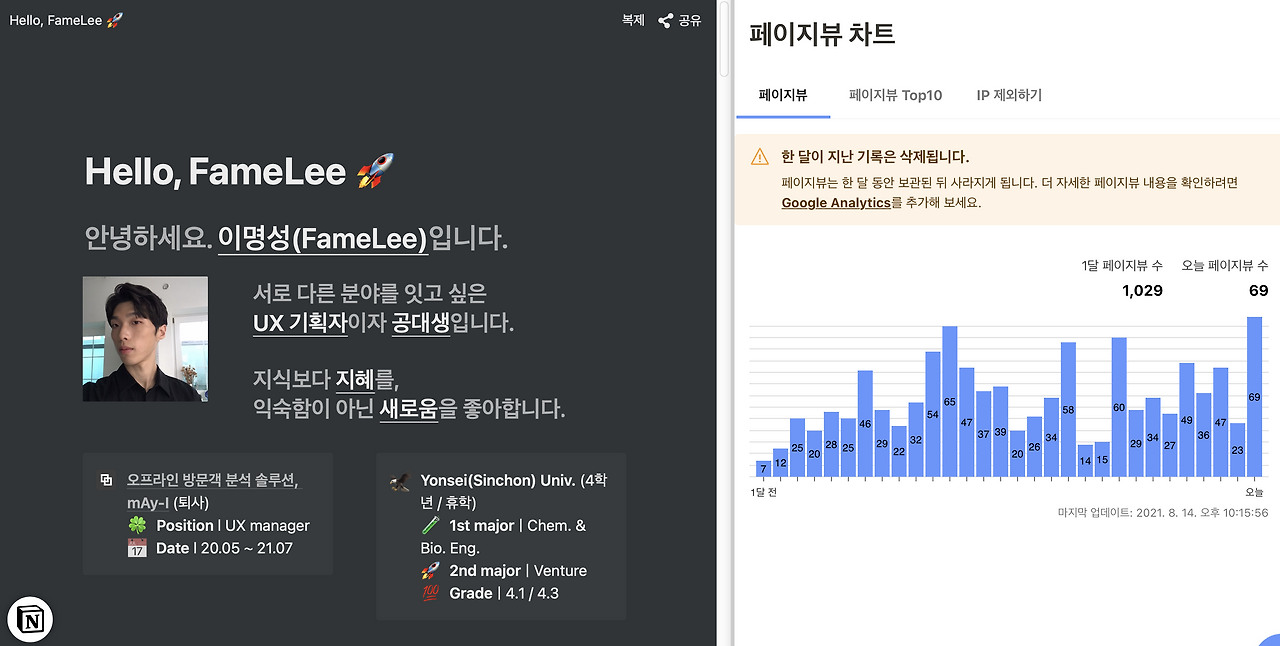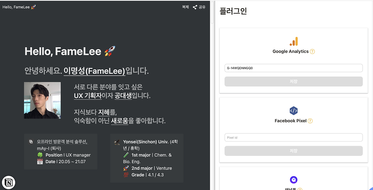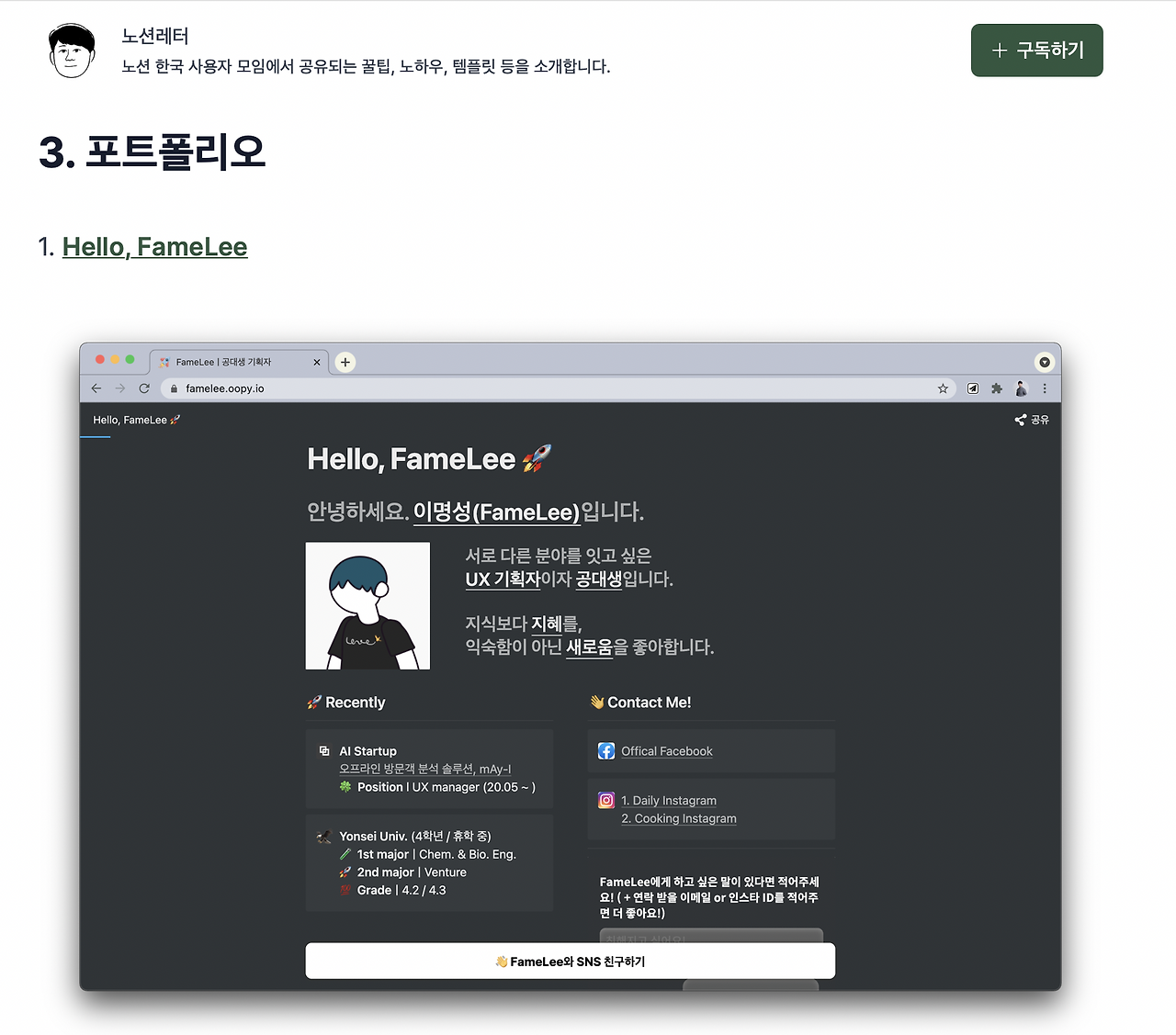노션 페이지 타이틀을 [Hello, FameLee]로 적었다. [Hello, FameLee]는 코딩을 시작할 때 가장 먼저 접하는 'Hello, World!'에서 착안했다. FameLee는 본명인 '이명성'을 뜻하는데, 퍼스널 브랜딩을 위해 밀고 나가는 닉네임이다. 인스타 아이디도 fame_lee 고, 브런치 닉네임도 FameLee다. 인스타 아이디를 famelee로 하고 싶었는데 이미 선점됐다 ㅠㅠ...