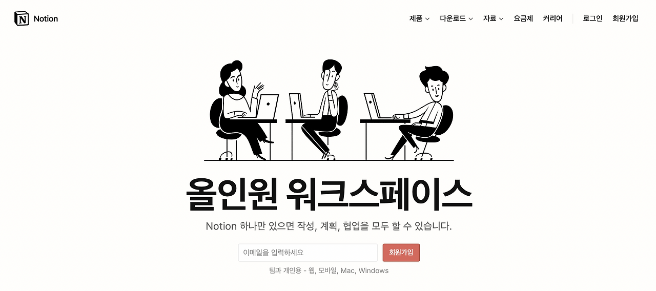 가장 애용하는 툴을 한 가지만 꼽으라 한다면, 주저 없이 노션(Notion)을 꼽을 것이다. 많은 분이 노션을 문서 툴이라고 말하지만, '문서 툴'이란 표현만으로 그 무궁무진한 활용성을 보여주기 어렵다. 노션도 스스로 문서 툴이 아니라, '올인원 워크스페이스'라고 말하는데, 홈페이지에 "Notion 하나만 있으면 작성, 계획, 협업을 모두 할 수 있습니다"라는 문구가 가장 먼저 우리를 반겨준다.
