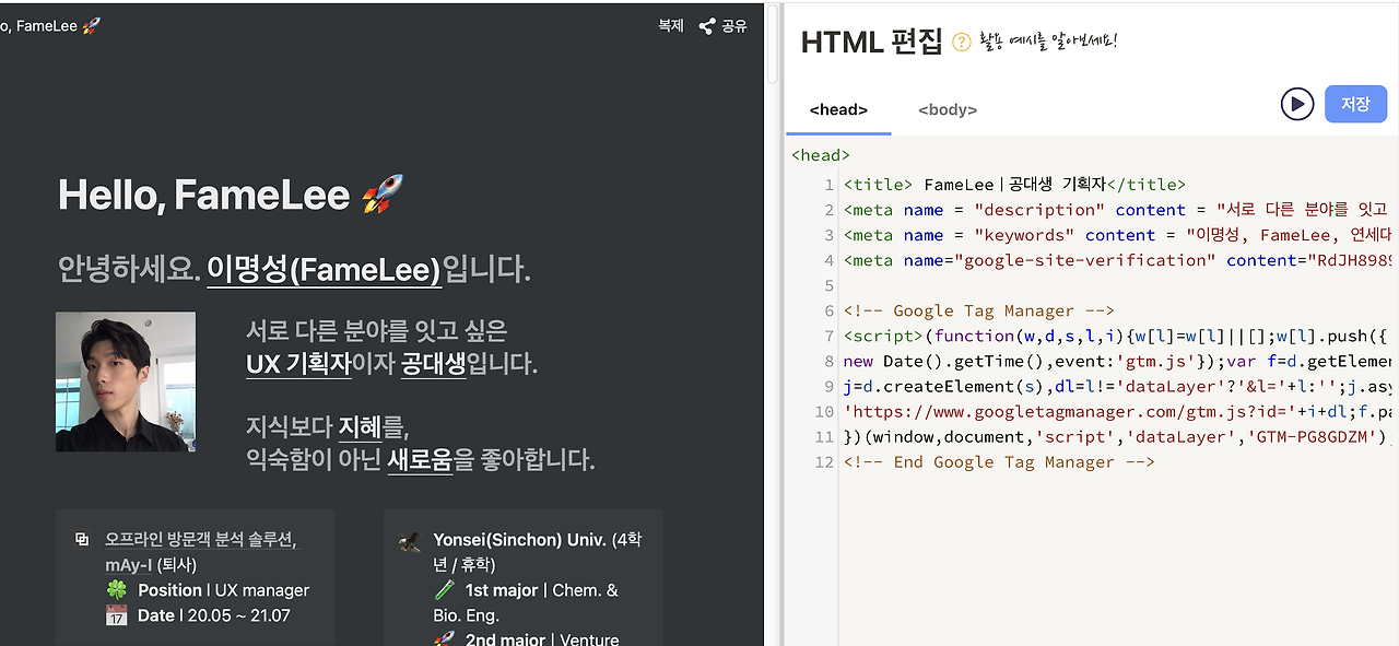 oopy를 이용하면 HTML을 직접 수정할 수 있다. meta 태그를 설정해 약간의 SEO 작업을 할 수도 있고, GTM 등의 데이터 툴과 연동시킬 수 있다.
