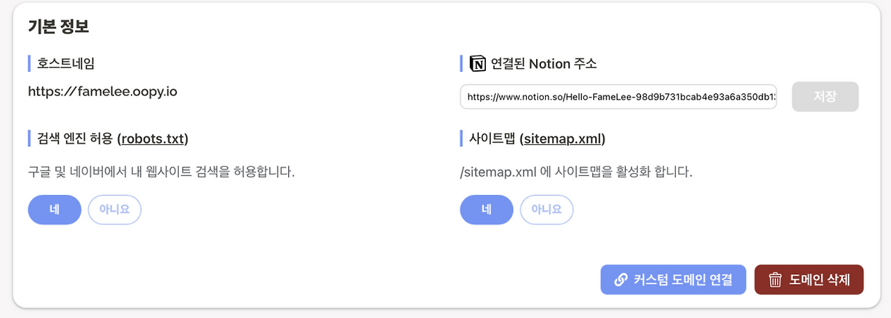 oopy는 완성된 노션 페이지를 홈페이지로 바꿔준다. 도메인을 생성하고, 이 도메인에 노션 링크를 연결한다. 사람들이 해당 도메인에 접속했을 때, 연결된 노션을 보여준다. 위와 같이, robots.txt나 sitemap.xml 활성화를 통해 검색 포털에서도 포트폴리오가 검색될 수 있게 도와준다.