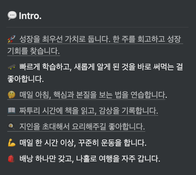 '나'란 사람에 대해 더 관심을 갖고, 입체적으로 이해할 수 있도록 [Intro 섹션]을 추가했다. 포트폴리오의 목차를 이 글에선 섹션으로 부르겠다. 내 일상생활, 루틴, 취미 등을 다양하게 적어서 '나'란 사람을 입체적으로 표현했다.