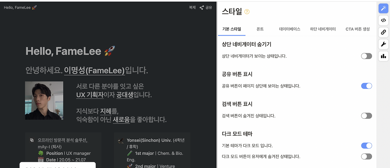 oopy는 단순히 도메인을 생성하는 게 아니라, 페이지에 디자인을 입혀서 홈페이지처럼 보여준다. 프로그레스 바, 버튼 등을 만들 수 있고, 글자 폰트, 다크 모드 등을 설정할 수도 있다.