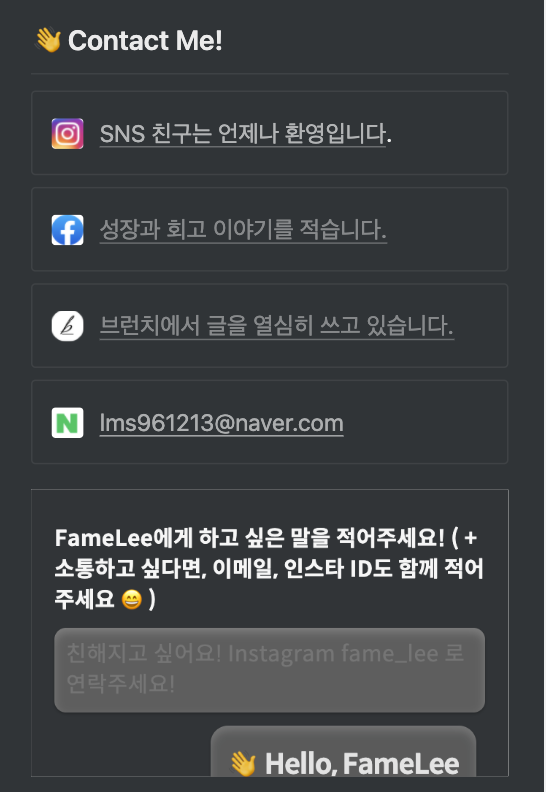 설정한 페르소나는 공적 연락에 부담을 느낀다. 따라서, 친목 목적의 연락을 환영한다는 톤으로 [Contact Me! 섹션]을 만들었다. 각 SNS 채널 링크를 연동하고, [SNS 친구는 언제나 환영입니다.] [친해지고 싶어요!] 등의 멘트를 사용했다. 또한, 최하단에 익명 입력창을 설정해서 최대한 부담없이 소통할 수 있도록 만들었다.