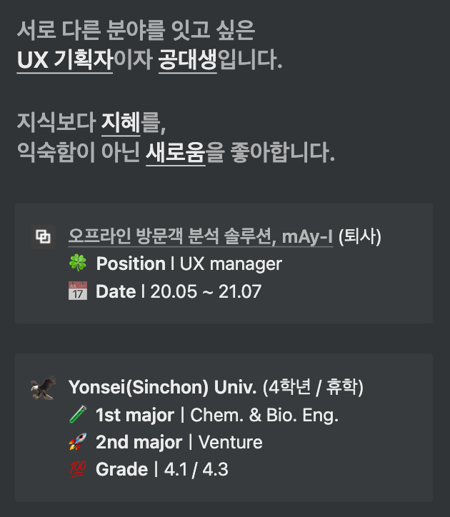 페르소나는 '나'를 전혀 모르므로, (1) 내 능력과 (2) 추구하는 가치를 각각 한 문장으로 요약해서 가장 먼저 보여줬다. 마치 일종의 선언문처럼, [서로 다른 분야를 잇고 싶은 UX 기획자이자 공대생입니다]로 능력을, [지식보다 지혜를, 익숙함이 아닌 새로움을 좋아합니다]로 추구하는 가치를 짧게 보여줬다.