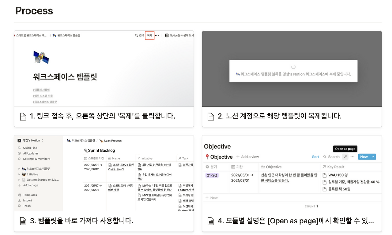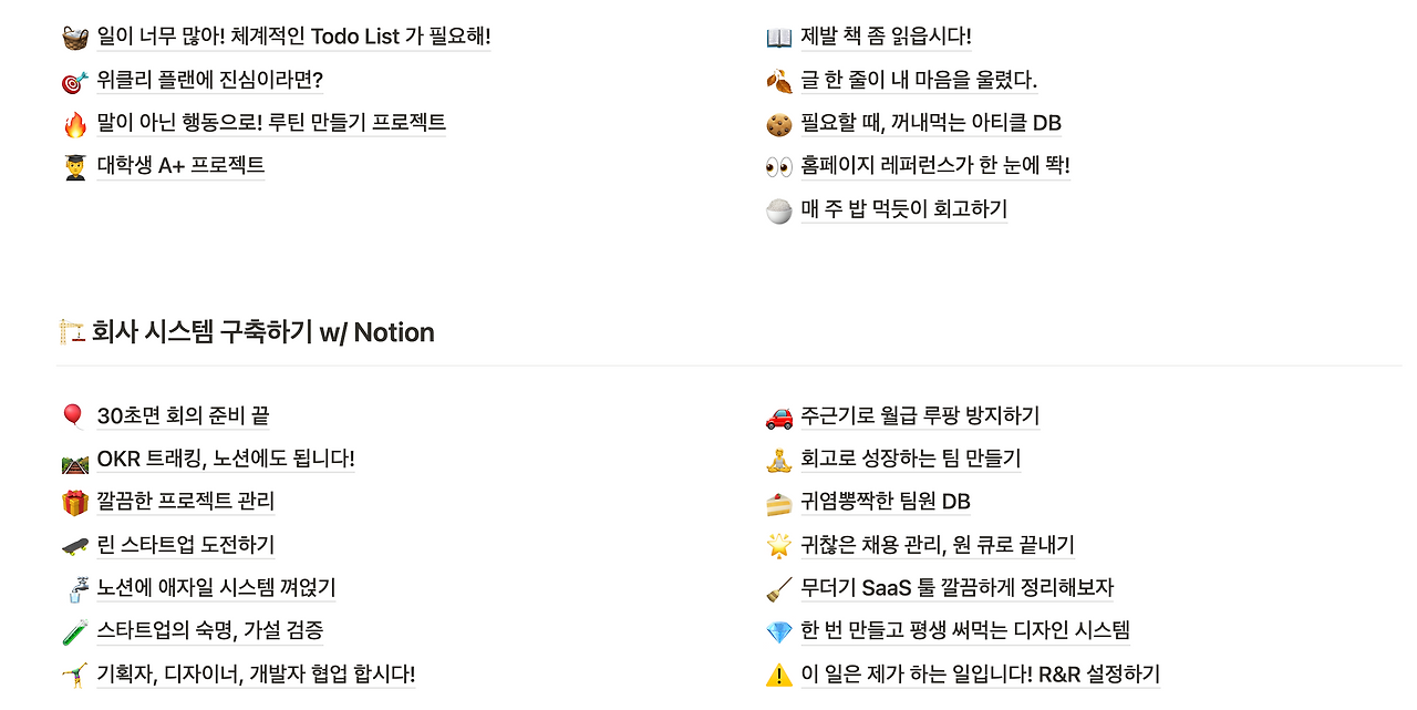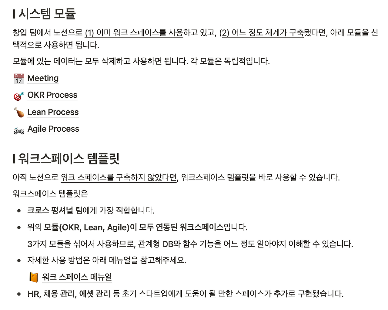 생각해보니 노션의 가장 큰 장점은 범용성이고, 초기 스타트업은 아스나, 지라 등 여러 툴을 사용하기보다 일단 1가지 툴인 노션을 집중해서 쓸 것이라 판단했다. 이 점을 노려, 아예 스타트업이 그냥 다운로드하여서 바로 쓸 수 있는 워크스페이스 템플릿을 만들어 보자고 생각했다. OKR, 린 프로세스, 애자일 시스템 등의 전략 및 업무 시스템과 HR, 채용 관리, 에셋 관리 등 보조 시스템으로 이루어진 워크스페이스 템플릿을 제작했다.