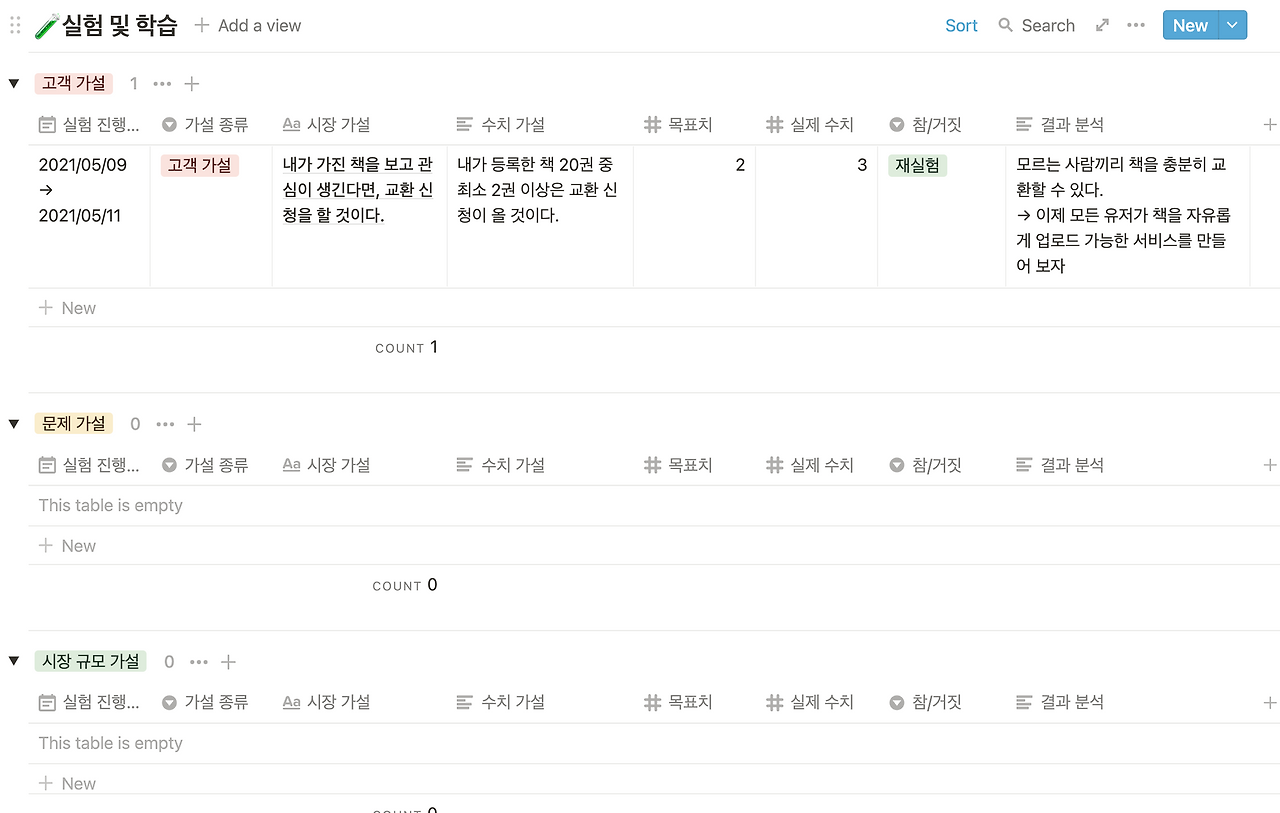 또한, 주변에서 스타트업 말고 일상에서 쓸 수 있는 템플릿이 있으면 좋겠다는 정성적 데이터를 수집했다. 어차피 작은 모듈을 다양하게 만들기로 방향을 설정했으니, 스타트업에서 쓰는 템플릿뿐만 아니라 일상에서 쓸 수 있는 템플릿도 구현하기로 결정했다. 일상 템플릿은 노션에서 평소 쓰고 있는 양식을 그대로 복붙 했고, 스타트업 템플릿은 1차 모델을 더 작게 쪼갰기 때문에, 2차 모델을 만드는 데 하루도 걸리지 않았다.