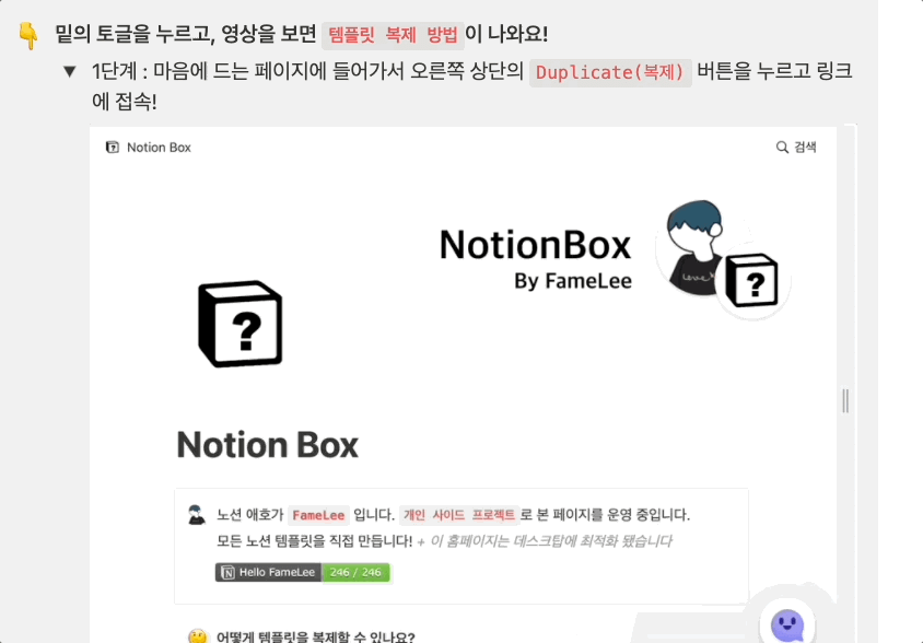 템플릿 중에서 관계형 기능이나 함수 기능이 들어간 게 있다. 노션을 시작한 지 얼마 안 된 분이라면, 이 기능을 모를 것이라 판단해 관련된 소개를 짤막하게 추가했다. 해당 기능을 알고 계신 분은 필요 없는 정보이므로 이 설명을 토글에 숨겨뒀고, 토글 색을 회색으로 바꿨다. 또한, 친근한 보이스 톤과 후킹을 위해 "아직 노션을 시작하지 얼마 안 됐다면? (a.k..a 노션 병아리)'라는 워딩을 사용햇다.