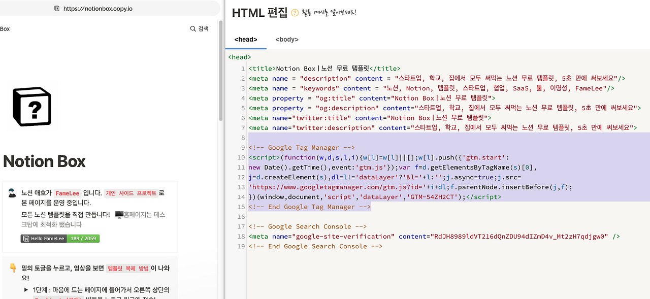이벤트를 트래킹하고 싶다면, GTM을 이용한다. GTM은 우피에서 플러그인 기능을 지원하지 않으므로, 직접 HTML에 심어야 한다. GTM 컨테이너를 생성하고, <head>와 <body>에 GTM 코드를 입력하면 반영된다.