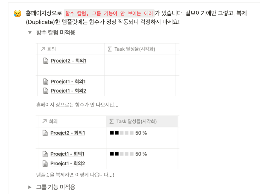 홈페이지를 만들다가 예상치 못한 문제에 직면했는데, 우피에서 변환한 홈페이지에서 노션 DB의 함수 칼럼은 전혀 보이지 않았다. 이 문제를 모르는 상태에서 템플릿을 본 유저는 당황할 수 있으므로, 반드시 다뤄야 하는 문제다. 하지만, 혼자서 완벽히 해소하기 불가능한 영역이라 판단했고, 다른 방법으로 햇징하기로 결정했다. 이 문제를 모르는 상태에서 템플릿을 보면, 유저가 당황할 수 있을 것이라 판단해 템플릿 바로 위에 이 부분을 알렸다.