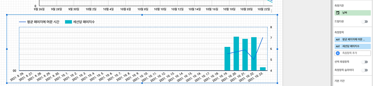 노션 박스에서 가장 중요한 것은 "사람들이 홈페이지에서 얼마나 활동적으로 있느냐?"와 "사람들이 어떤 템플릿에 관심을 갖느냐?'였다. 홈페이지의 활동성을 빠르게 파악하기 위해, 세션당 페이지 수와 평균 페이지에 머무는 시간을 보여주는 차트를 먼저 구현했다.