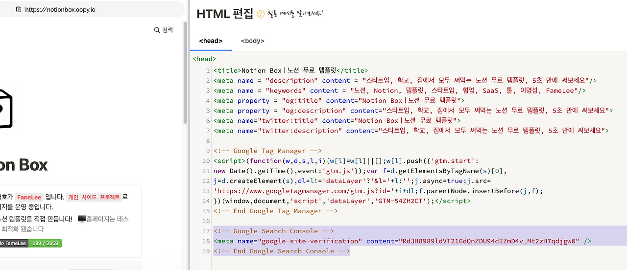 가장 먼저 meta tag 설정 작업을 진행했다. meta tag를 적절하게 설정하면, (1) SEO에 영향을 줘서 포털 검색의 노출 기회를 높일 수 있고, (2) 링크 공유에서도 흥미를 자극할 수 있다. <head>에서 페이지의 타이틀을 보여주는 <title> 태그와 페이지 소개를 보여주는 <meta name = description>, <meta name = "keywords"> 태그를 생성했다. 아래 썸네일에서 보면 알 수 있듯이, <title>에 적은 내용이 제목으로 나오고, <meta name = description>에 적은 내용이 부제로 나오는 걸 볼 수 있다.