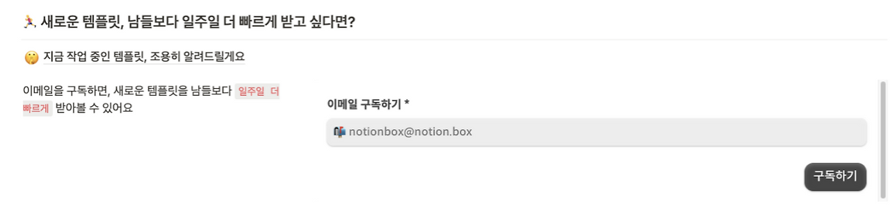조이를 활용해 이메일 구독 서비스도 구현했다. 홈페이지의 구독율을 높이기 위해, 구독자가 받을 수 있는 혜택을 직접적으로 명시했다. 이메일 구독 시 남들보다 일주일 더 빠르게 템플릿을 받아볼 수 있다는 멘트를 노출했고, 사람들의 기대감을 높이고자 현재 어떤 템플릿을 작업 중인지 추가로 적어놓았다.