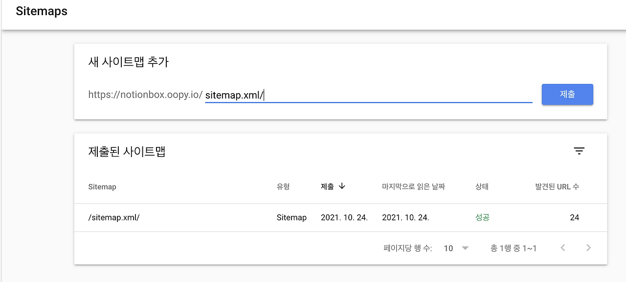 갑자기 코드 같은 게 나와서 쫄 필요는 없다. '파일'을 제출해야 한다고 하지만, 우리가 뭔가를 만들 필요는 없다. 왜냐하면 이미 홈페이지가 이 파일을 갖고 있기 때문이다. 서치 콘솔의 [sitemaps] 탭에 들어가면, 인증한 사이트 링크가 있을 것이다. 이 뒤에 sitemap.xml/ 를 입력하고 제출하면 끝이다. 성공적으로 사이트맵 파일이 제출됐으면, 아래와 같이 상태에 '성공'이 뜬다.