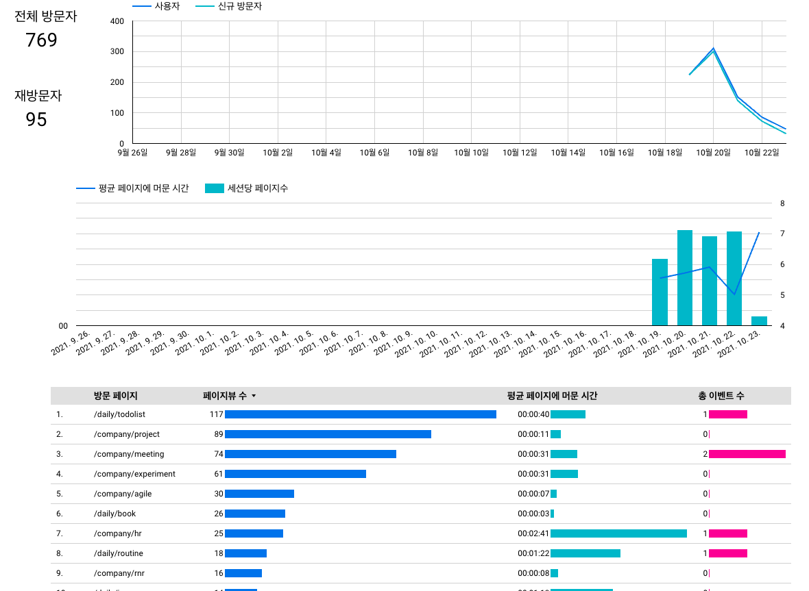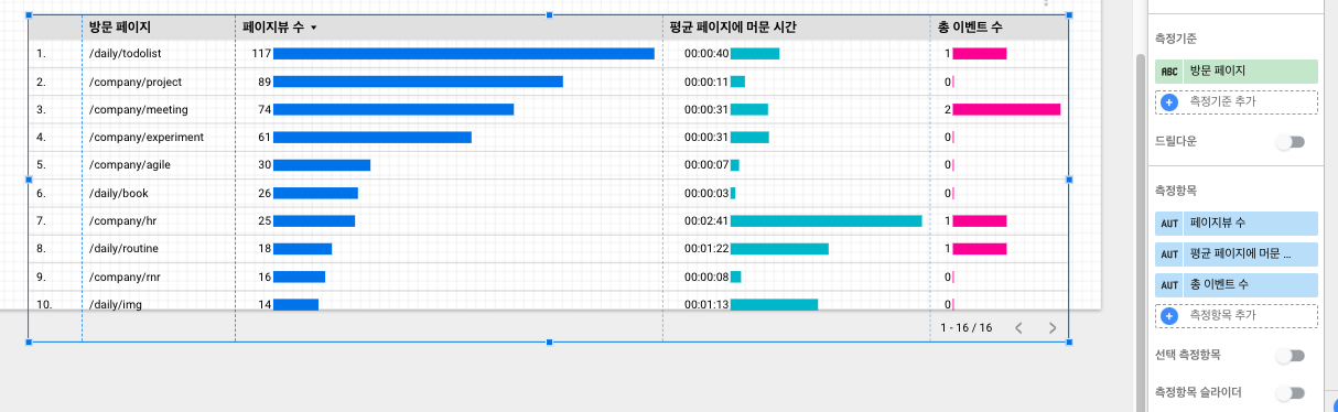 그리고 사람들이 어떤 템플릿에 관심을 갖는지 파악하기 위해 페이지 별 뷰 수, 평균 머문 시간, 총 이벤트 수를 보여주는 차트를 구현했다.