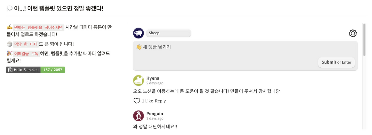 새로운 템플릿에 대한 아이디어를 받고, 유저 인터렉션을 높이기 위해 조이(Joey)라는 서비스를 활용했다. 조이를 활용하면 노션으로 만든 홈페이지에서 댓글 남기기, 좋아요, 설문 조사 등 다양한 것을 할 수 있다. 아래와 같이 조이를 통해 댓글창을 구현했고, 사람들이 원하는 템플릿이 있다면 자유롭게 써달라는 말을 남겼다. 이를 통해 (1) 고객의 잠재 니즈를 어느 정도 체크할 수 있고, (2) 홈페이지 첫 방문자는 댓글창을 보며 서비스가 활발히 운영되고 있다고 생각하게 만들 수 있다.