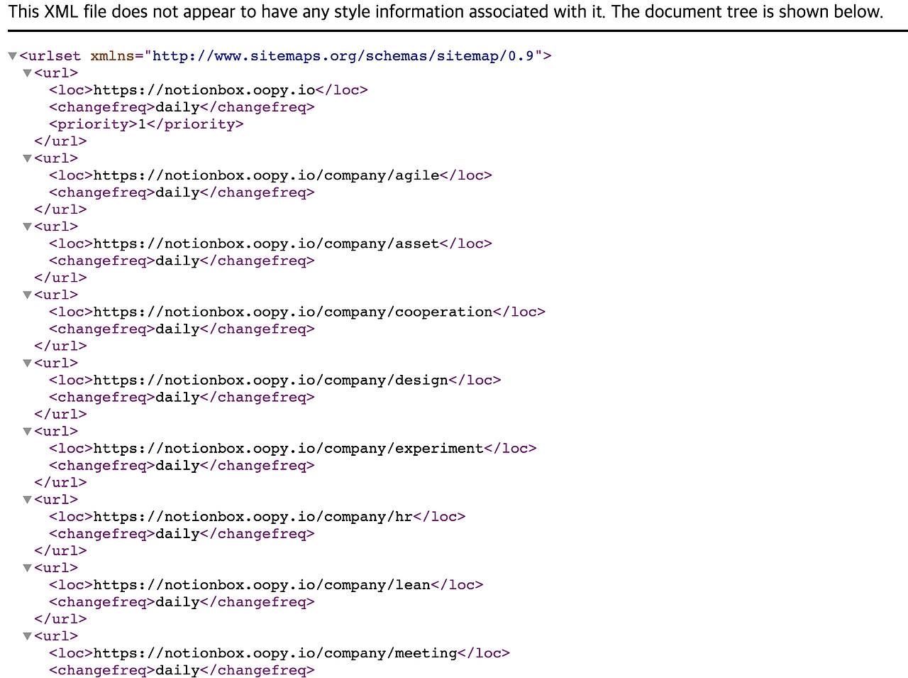 구글 포털에서 싸이트가 뜨는 원리는 다음과 같다. 우선, 구글 봇 크롤러가 다양한 싸이트의 HTML을 크롤링한다. 사용자가 포털에서 검색을 하면, 이 검색 키워드를 크롤링 데이터와 비교한 후에 순위를 매겨서 포털 검색 결과로 보여준다. 이를 바꿔 말하면, 봇 크롤러가 홈페이지를 크롤링하지 못하면, 포털 검색에서 결과값으로 나타나지 못한다. 싸이트를 서치 콘솔에 등록했으면, 사이트맵 파일을 콘솔에 등록을 하면 봇 크롤러가 자동으로 인식한다. 사이트맵은 해당 사이트와 다른 사이트의 연결 구조에 대한 정보를 저장한 파일이다. 아래 파일은 노션 박스의 사이트맵 파일인데, 보면 서로 다른 링크(ex. notionbox.oopy.io/company/agile)와 연결됐음을 확인할 수 있다.