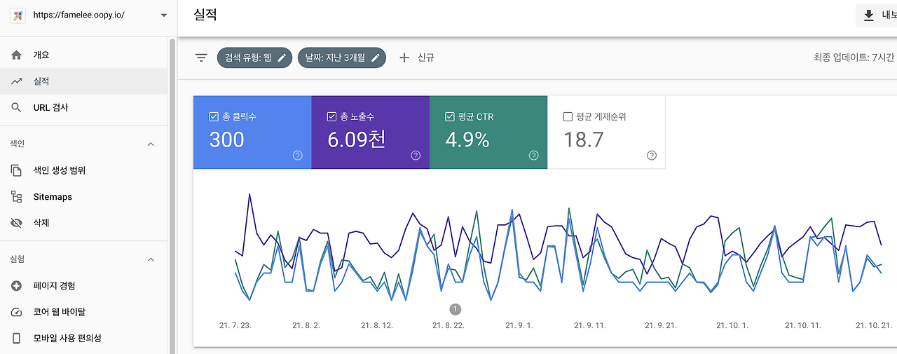 포털에서 사이트 노출 전략을 위해 구글 서치 콘솔과 연동을 했다. 서치 콘솔에 등록을 하면, 포털에서 어떤 키워드 검색을 통해 사람들이 들어왔고, 각 키워드마다 CTR이 얼마나 되며, 핵심 키워드가 무엇인지 데이터로 확인할 수 있다. 아직 노션 박스의 데이터가 수집이 안 되서 아무 것도 없는 상태라, 포토폴리오의 서치 콘솔 화면을 가져왔다.