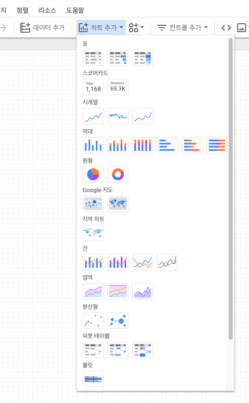 Google Studio에서 빈 대시보드를 만들고 [데이터 추가] 버튼을 누르면, 내 계정의 GA에서 수집하는 데이터를 아래처럼 쉽게 불러올 수 있다. 그리고, 이 데이터를 활용해 다양한 대시보드 차트를 생성할 수 있다.