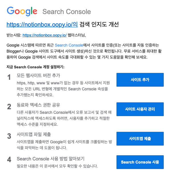 서치 콘솔 등록을 위해 <head>에 서치 콘솔 인증키를 심어넣으면 된다. 해당 인증 키는 구글 서치 콘솔을 에 접속해 도메인을 등록한다고 하면, 인증키를 받을 수 있다. 인증이 완료되면 다음과 같이 구글 서치 콘솔에서 인증 확인 메일이 온다.