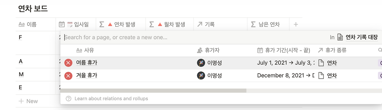 그렇다고 여기서 끝나긴 뭔가 아쉽다. 소비 연차를 하나하나 카운팅하는 게 매우 번거롭지 않을까? 이제 앞선 게시글에서 구현한 [연차 기록 대장]을 가져올 차례다. 관계형 칼럼을 하나 추가하고, [연차 기록 대장] DB와 연결한다. 이 후, 해당 유저가 [연차 기록 대장]에서 작성한 내용을 모두 불러온다. 이제 팀원이 어떤 휴가를 등록했는지를 [연차 보드]에서 확인할 수 있다.