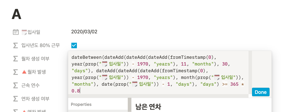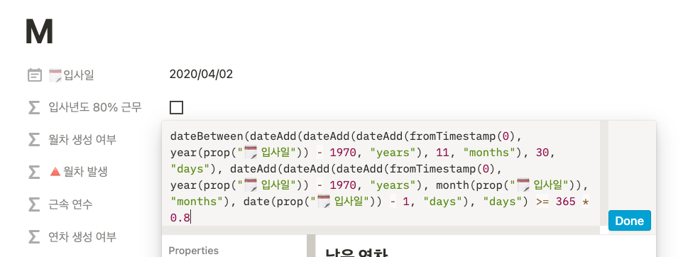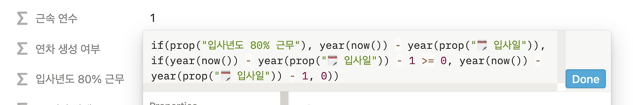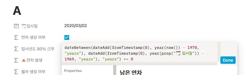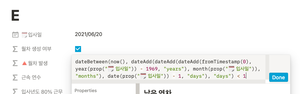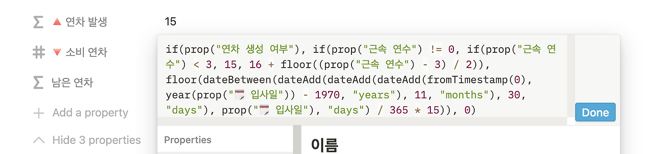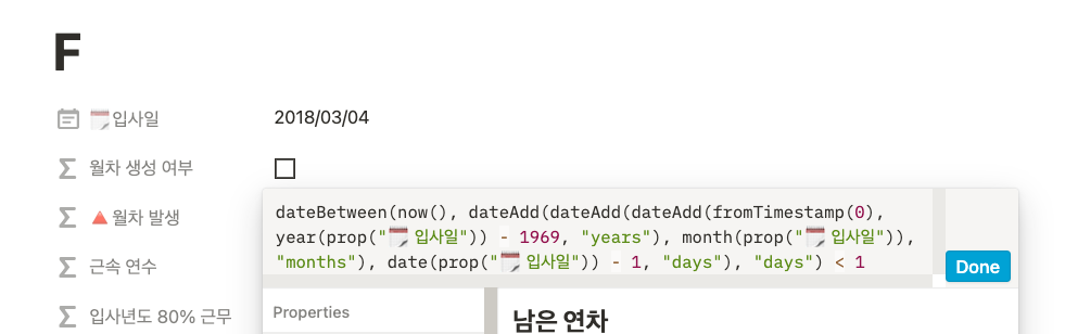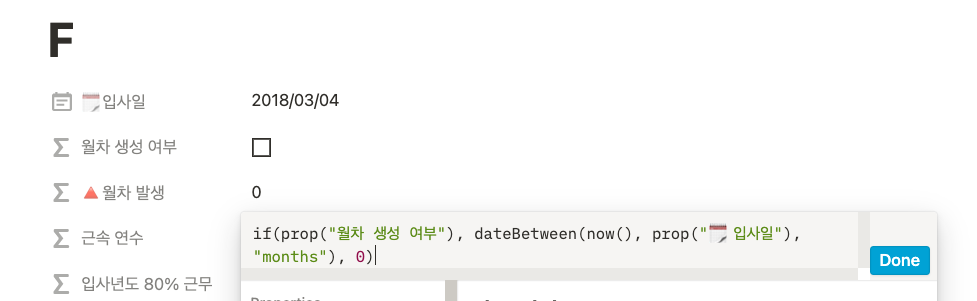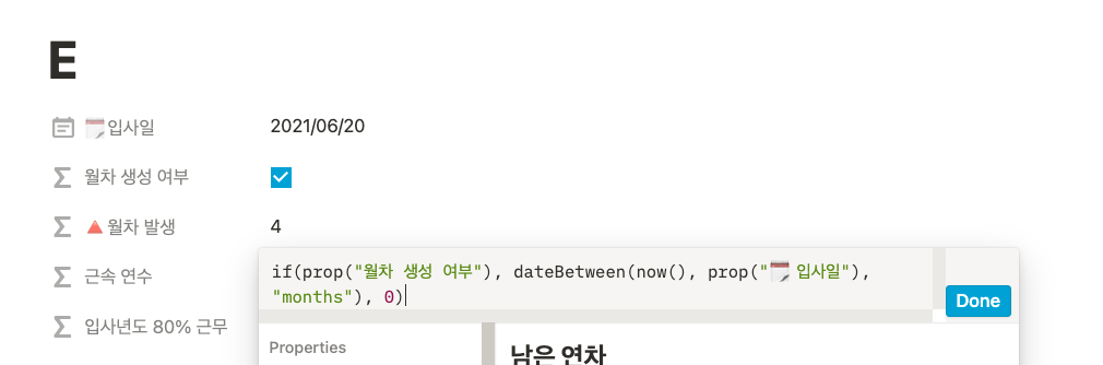 이제 현재 날짜에 월차가 몇 개가 생성됐는지를 보여주는 [월차 발생] 칼럼을 만들어보자. 해당 칼럼은 앞서 구한 [월차 생성 여부] 칼럼에 True일 때만 계산이 되고, False가 되면 0이 나오도록 해야 한다. 왜냐하면, 현행법상으로 월차는 입사일로부터 1년이 됐을 때, 모두 사라지기 때문이다. if()로 월차가 생성되는지 판단하고, 생성되는 경우에 월차는 dateBetween()과 now()를 사용해 계산할 수 있다.