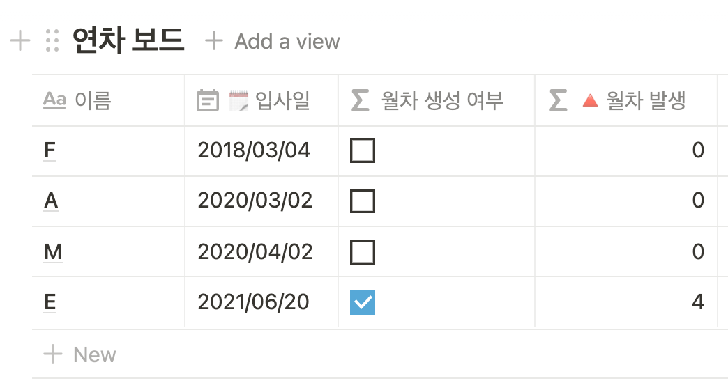 [월차 발생] 칼럼 : 입력한 입사일과 현재 시점을 비교해, 몇 개의 월차가 생성되는지 보여준다.