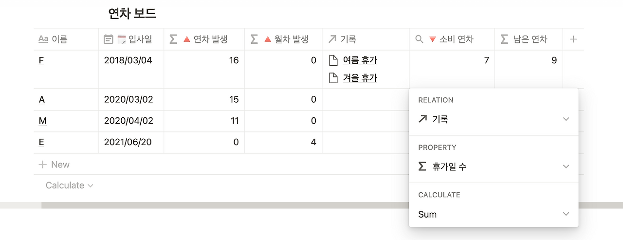 이제 기존 [소비 연차] 칼럼을 롤업 칼럼으로 바꾼다. 아래와 같이, 관계를 맺은 [연차 기록 대장] DB 내 [휴가일 수] 칼럼의 데이터를 불러오고, 여기서 SUM 계산을 적용하자! 이제 [연차 기록 대장]에 휴가를 쓰기만 해도, 각자가 얼마나 연차가 남았는지 확인할 수 있다.