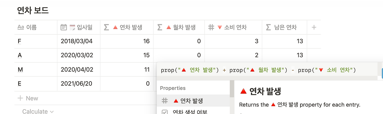앞선 과정을 통해 입사일에 따른 연차와 월차 생성 갯수를 자동 계산할 수 있게 됐다. 이제 휴가를 얼마나 소비했는지를 보여주는 [소비 연차]칼럼과, 잔여 연차를 보여주는 [남은 연차] 칼럼을 만들면 대시보드가 완성된다.