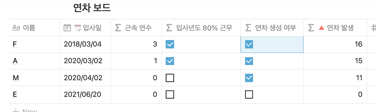 [연차 생성 여부] 칼럼 : 연차가 생성되는지 보여주는 칼럼으로, 입사년도로부터 그 다음 년 1월 1일부터 체크된다.