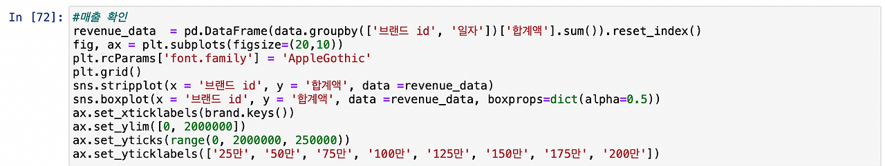 앞선 과정과 동일하게, 브랜드별 일별 매출을 나열해서, 꾸준히 매출을 내는 브랜드를 찾을 수 있다. 확인 결과, 타 브랜드 대비 불뚝이 압도적으로 높음을 볼 수 있다.