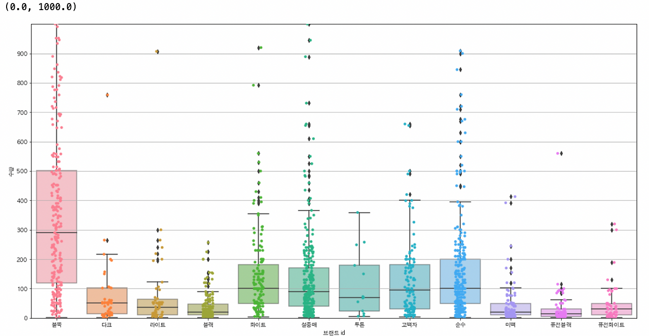 그렇다면, 불뚝을 잇는 상품은 뭐가 있을까? 불뚝에 이어 투톤이 가장 높은 위치에 있지만, 데이터 포인트를 보면 알 수 있듯이 적은 표본으로 인한 오류다. 표본 수를 고려해 본다면, 화이트, 설중매와 고백자가 불뚝의 뒤를 잇는 브랜드임을 알 수 있다.