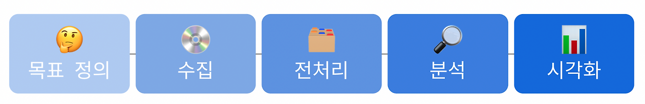데이터 분석 과정은 크게 아래와 같다. 가장 먼저 '분석 목표'를 설정해야 한다. 목표를 정하지 않은 체, 무턱대고 분석을 시작하면 데이터 바다에 매몰되기 쉽다. 무엇을 검증하고 싶은지 명확히 해야지, 이후의 분석 과정이 효율적으로 진행된다. 목표를 설정했으면, 관련된 데이터를 수집하고 전처리를 한다. 분석에 용이하도록 재가공된 데이터를 뜯어보고, 시각화를 통해 핵심 인사이트를 수집한다.