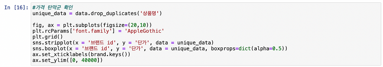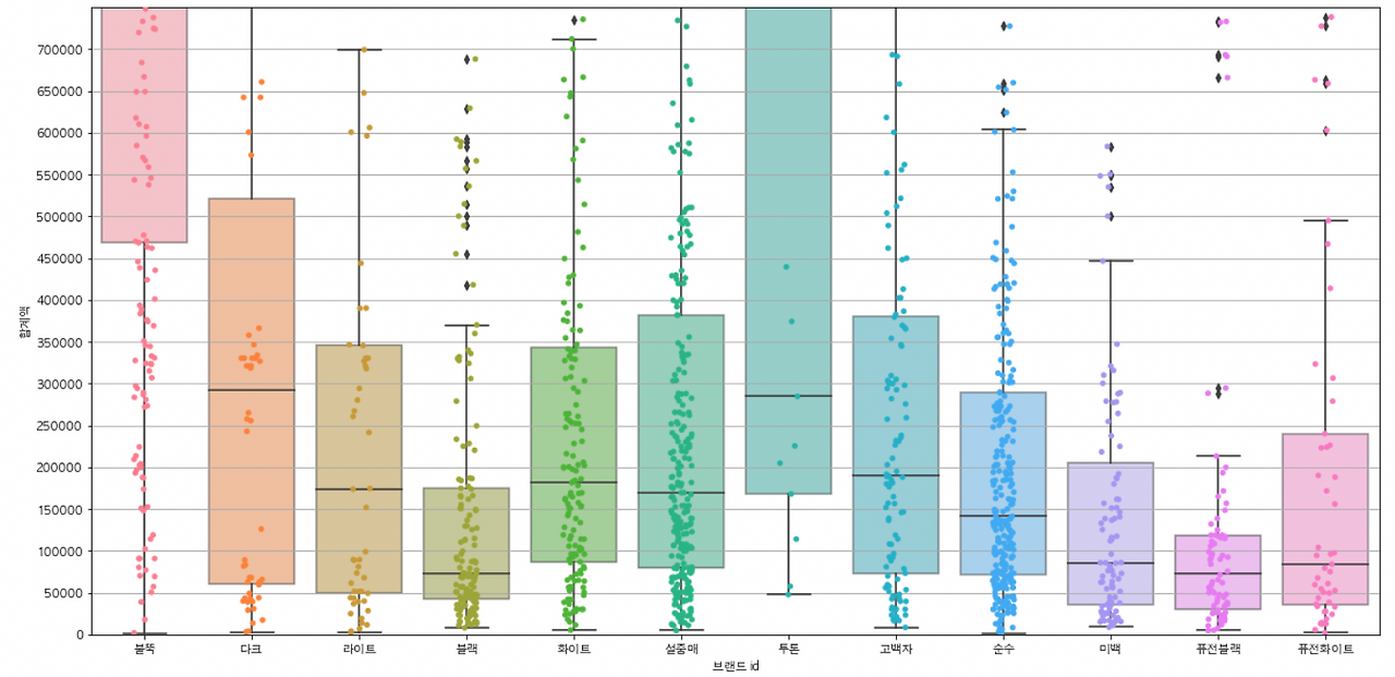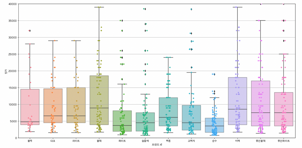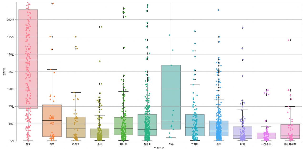 동일 품목의 중복 집계를 막기 위해, 매출 데이터에서 상품명을 기준으로 한 고유 데이터를 추출한다. 가격 탄막을 boxplot으로 그려보고, 탄막을 이루는 개별치를 stripplot으로 시각화한다. boxplot은 상자 수염이라는 그래프를 보여주며, 여기서 백분위를 기준으로 데이터 분포를 확인할 수 있다. 박스는 1분위와 3분위를 가리키고, 박스 안에 있는 선은 2분위(중앙값)을 가르킨다. 상자 위와 아래에 있는 선은 최솟값, 최대값을 나타내고, 이 선 너머의 값은 아웃라이어로 분류된다.