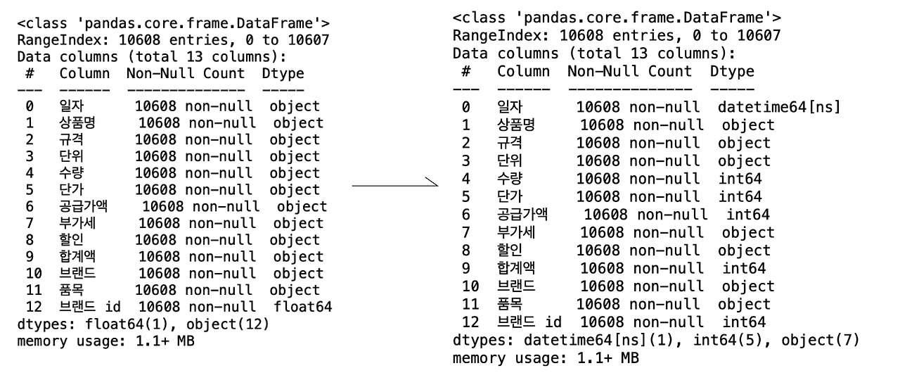 pandas로 읽은 csv 파일 내 데이터는 모두 object(=string) 타입이므로, 각 데이터를 적절한 타입으로 다시 바꿔줘야 한다. 데이터 타입까지 설정이 완료되면, 전처리 과정이 끝난다. 최종적으로 12개의 브랜드에서 10,608의 판매 건 수를 확인할 수 있다.