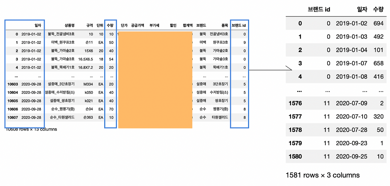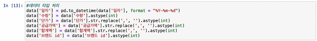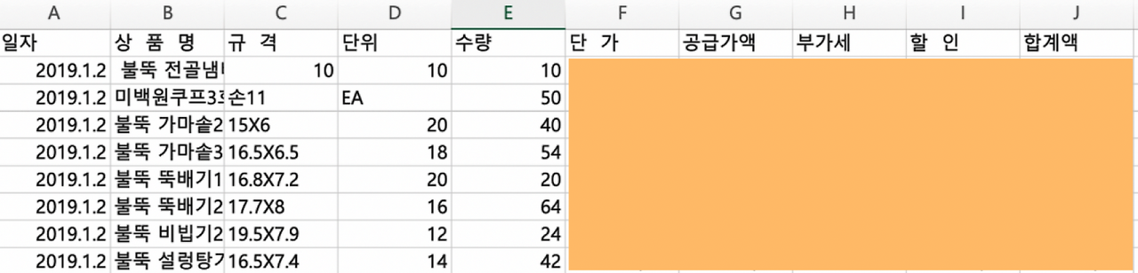 분석에 활용할 데이터를 매출 관리 시스템에서 csv에서 추출하고, 이를 pandas로 읽어왔다. 로우 데이터를 곧바로 분석하기 힘들니, 분석에 용이한 형태로 바꾸기 위해 전치리를 진행했다.