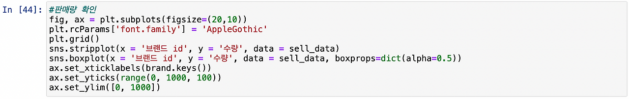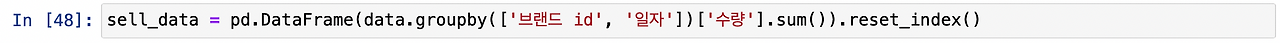 가격 탄막를 알았으니, 이제 판매량을 보자. 각 브랜드가 하루에 몇 개나 팔리는지 집계하고, 일 별 판매량의 분포도를 보면 꾸준히 팔리는 브랜드를 알아낼 수 있다. groupby 메소드를 이용해 브랜드와 날짜를 기준으로 그룹핑해, 브랜드 별 일별 판매량을 알아낼 수 있다.