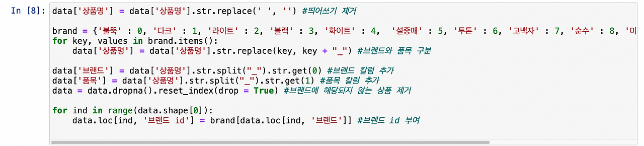 데이터의 상품명 칼럼은 2가지 정보를 담고 있는데 (1) 브랜드 이름과 (2) 품목명이다. 예를 들어, '불뚝 뚝배기'에서 '불뚝'은 브랜드고, '뚝배기'는 품목을 뜻한다. 앞으로 '브랜드', '품목', '상품(브랜드 + 품목)'을 구분해서 쓸 예정이다. 분석 목표가 '주력 브랜드'를 찾는 것이므로 '상품명' 칼럼을 '브랜드' 칼럼과 '품목' 칼럼으로 쪼개야 한다. 또한, 데이터 시각화를 돕는 seaborn이 문자 데이터를 받지 못하기 때문에, 각 브랜드마다 id 값을 부여한다.