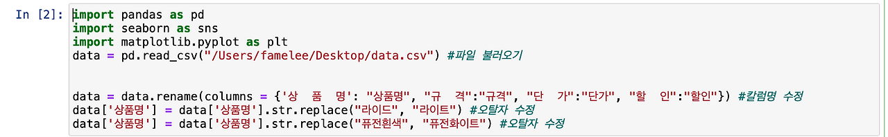 직접 데이터를 훑어본 결과, 칼럼명과 일부 상품명에 오탈자를 찾았다. 칼럼명의 경우, '상품명'을 '상 품 명'으로 적힌 것처럼, 불필요한 띄어쓰기가 있다. 일부 상품명에서 '라이트'를 '라이드'로 쓰기도 했고, '흰색'과 '화이트'를 혼용해서 사용했다. 칼럼명은 깔끔하게 바꾸고, 상품명은 같은 단어로 통일했다.