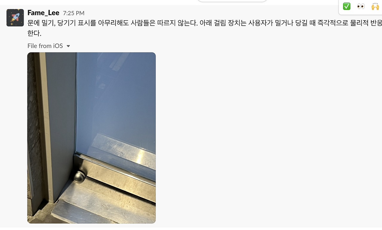 이 책을 읽고 난 후, 일상에서 UX 사례가 있으면 사진을 찍고 슬랙에 남기는 루틴을 도전하고 있다. 해당 루틴을 의식하고 행동하다 보니, 생각보다 재밌는 요소를 많이 보게 된다. 한 번 다른 분들도 이런 루틴을 가져보는 건 어떨까?
