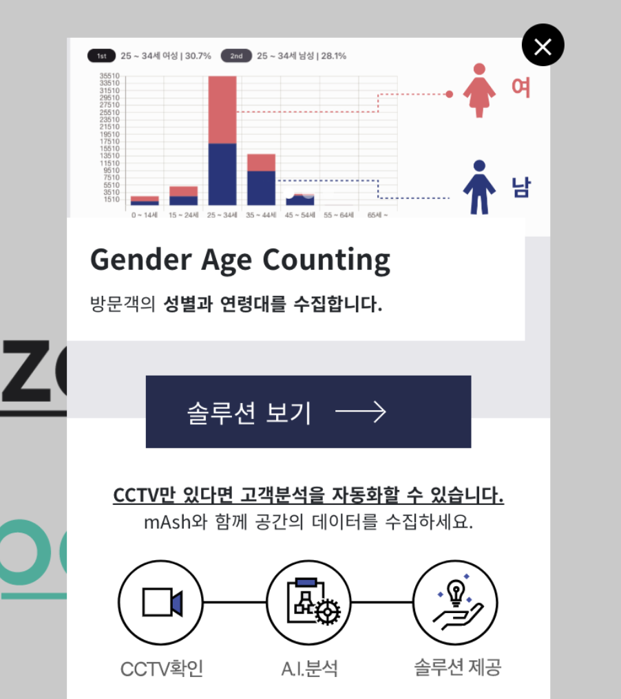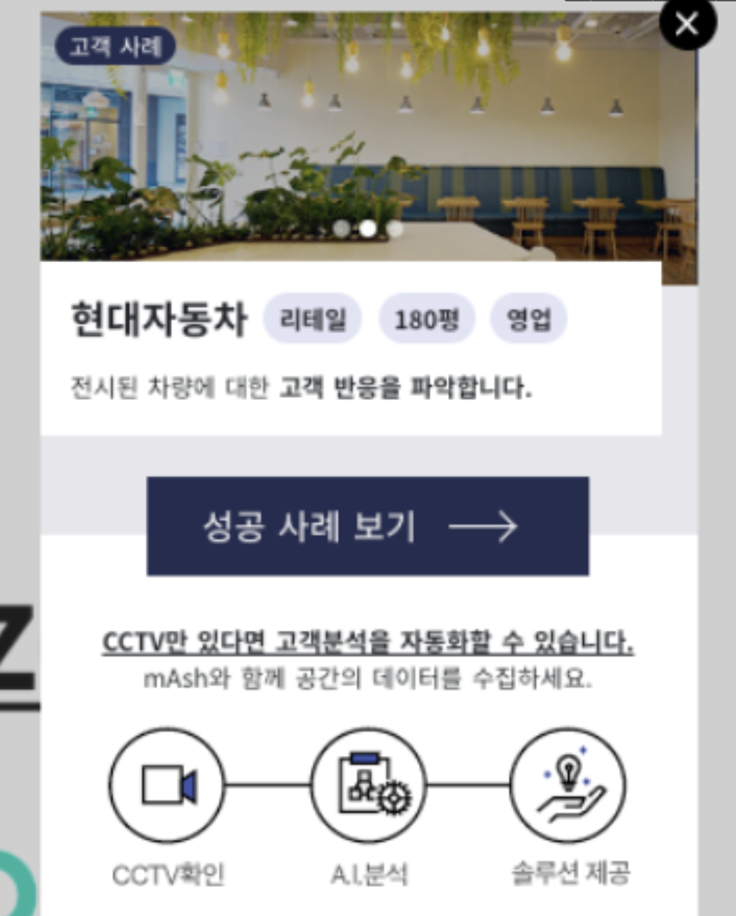 고객에게 매력을 보여줄 요소로 '효과' 말고, '고객 사례'를 이용하기로 했다. 메이아이 솔루션을 성공적으로 쓰고 있는 고객의 사례를 전면에 강조함으로써, 재방문자의 매장과 유사한 곳에서 솔루션이 사용되고 있음을 직관적으로 보여줬다.