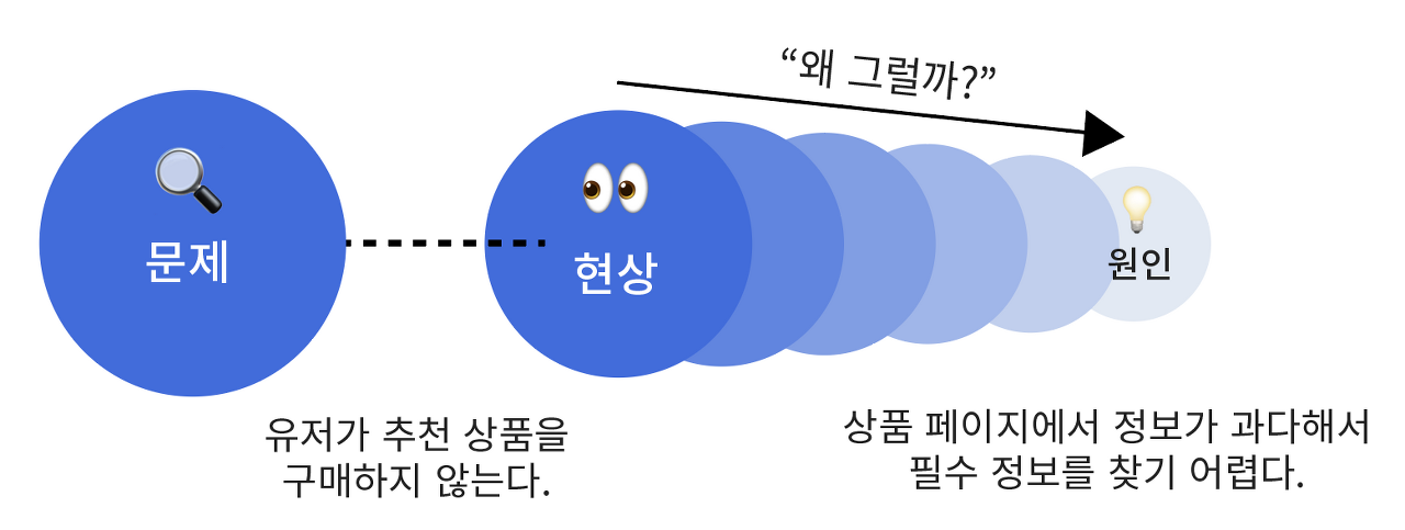 이해를 돕기 위한 예시를 들어보자. '유저는 자신에게 맞는 상품을 추천받으면, 구매 버튼을 더 많이 클릭할 것이다.'라는 가설과 함께 큐레이팅 기능을 구현했지만, 별다른 변화가가 없었다고 해보자. 여기서, '구매 버튼 클릭에 변화가 없다.'는 겉으로 보이는 '현상'일 뿐 '원인'이 아니다. 오히려, 상품 페이지에 정보가 과다해 흥미를 잃고 이탈했을 수 있다. 그렇다면, 여기서의 '원인'은 '상품 페이지의 과다한 정보'가 된다.