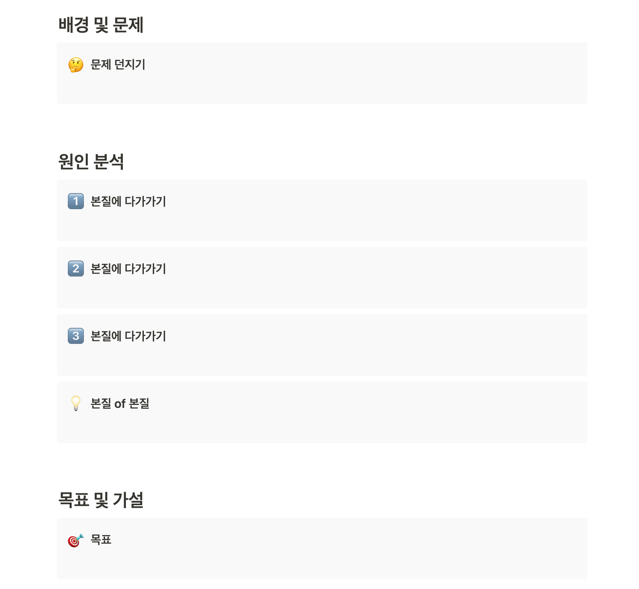 매 번 5 Whys를 하나하나 입력하는 건 번거로운 작업이다. 그렇기에, 나는 기획 문서를 작성할 때마다, 노션의 템플릿 기능을 적극 활용한다.