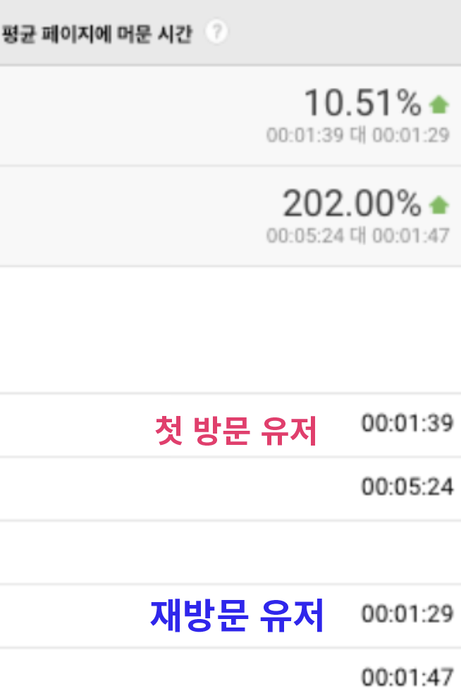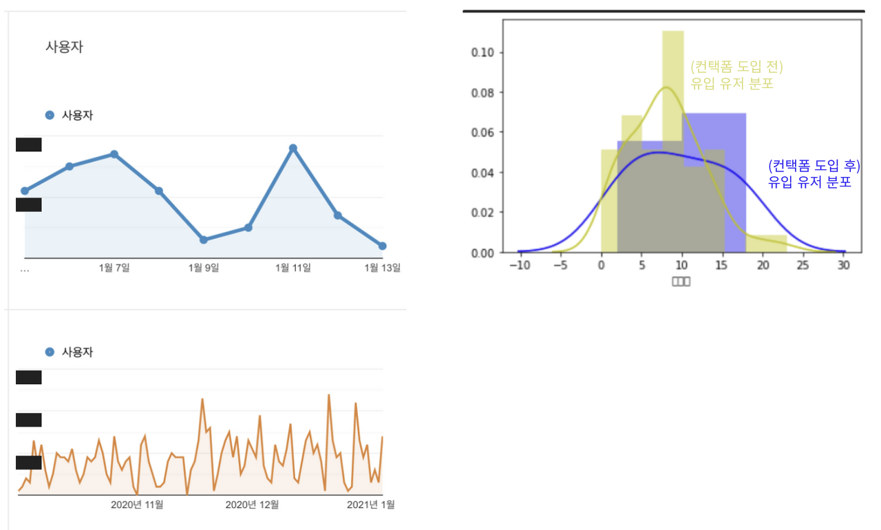 컨택 수에 변화가 없는 이유를 알기 위해, 홈페이지 GA(Google Analytics, 유저 로그 데이터 분석 툴)를 확인했다. 컨택 폼 도입 전후로, 홈페이지의 검색 유입 유저는 큰 차이가 없었다. 대신, 첫 방문자의 체류시간은 일정한 반면, 재방문자의 체류시간은 큰 폭으로 증가함을 확인했다. 즉, 재방문자는 컨택 폼에 관심을 가졌지만, 그럼에도 컨택하지 않음을 확인했다.
