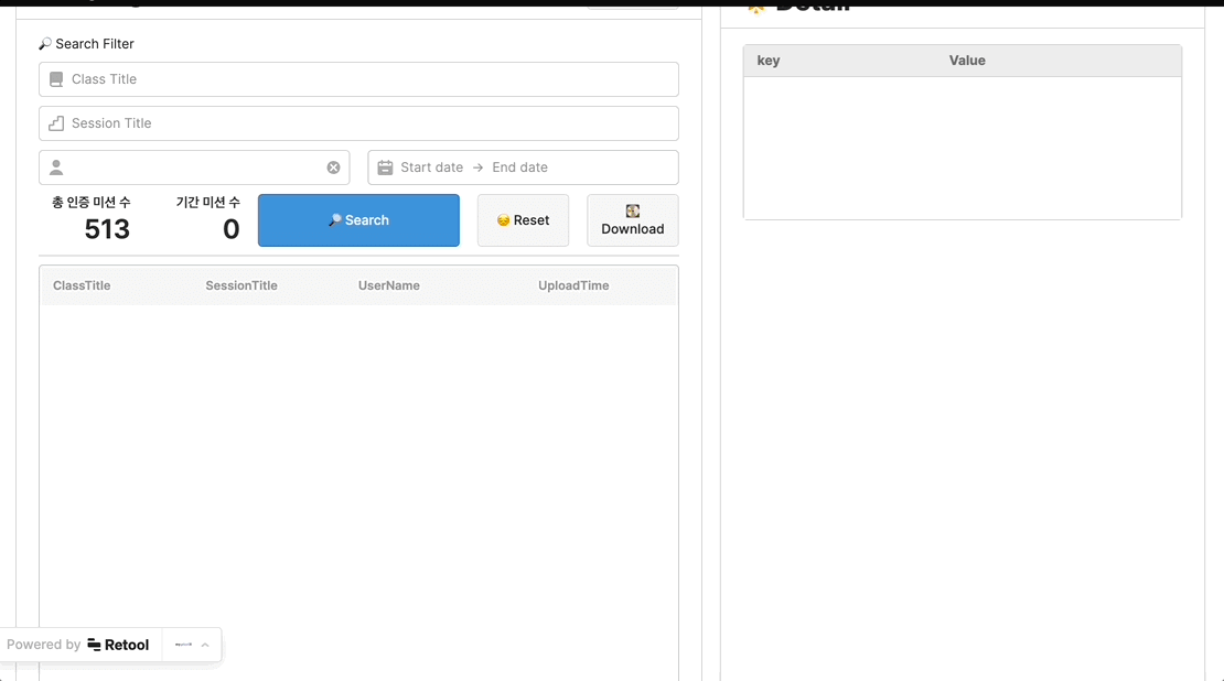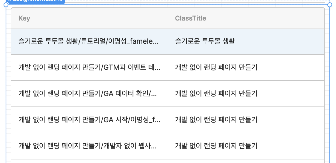 [COLUMNS] 영역에서 기존 데이터를 활용해 새로운 칼럼을 만들 수 있다. 새로운 칼럼을 만들면, [Value] 입력란에 해당 컬럼에 어떤 데이터를 집어넣을지 설정할 수 있다. 여기에 {{currentRow.Key.split("/")[0]}을 입력했는데, "테이블의 각 행"에 있는 "Key 속성 값"을 "/" 기준으로 쪼개서 리스트로 만든 후에 "0번째 값"을 호출한다는 의미다. 그러면, 아래 이미지처럼 Key 속성 값에서 클래스 이름만 추출해서 확인할 수 있다. 이런 방식으로 클래스, 세션, 닉네임, 날짜별로 테이블에서 보이도록 설정할 수 있다.