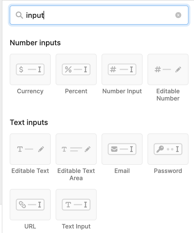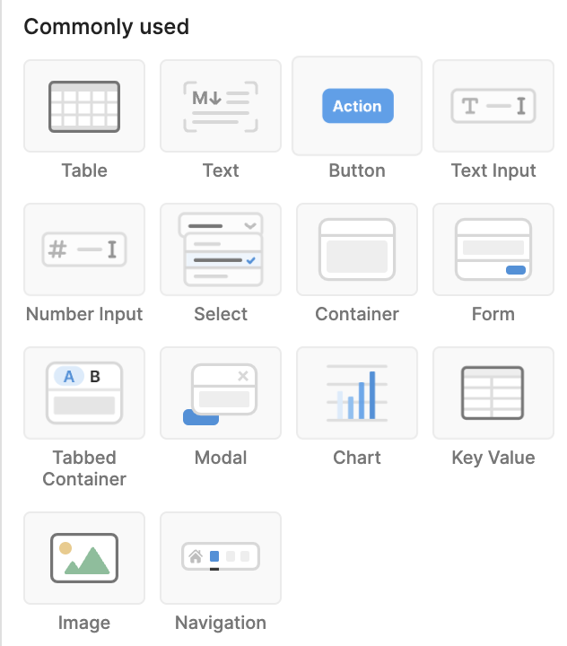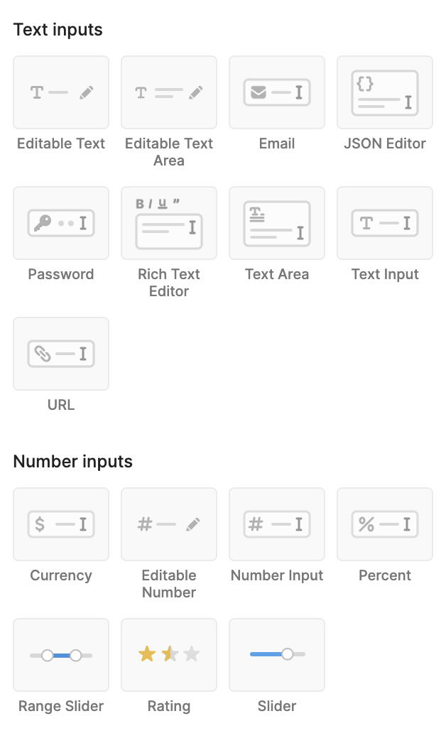 이제 불러온 데이터를 UI 컴포넌트에 집어넣으면 된다. 컴포넌트 관리 패널을 보면, 아래 이미지처럼 다양한 컴포넌트가 있는 걸 볼 수 있다. (1) 불러온 데이터를 보여주는 테이블 등의 output 컴포넌트 말고도 (2) 데이터 자체를 입력하는 input 컴포넌트도 생성할 수 있다.