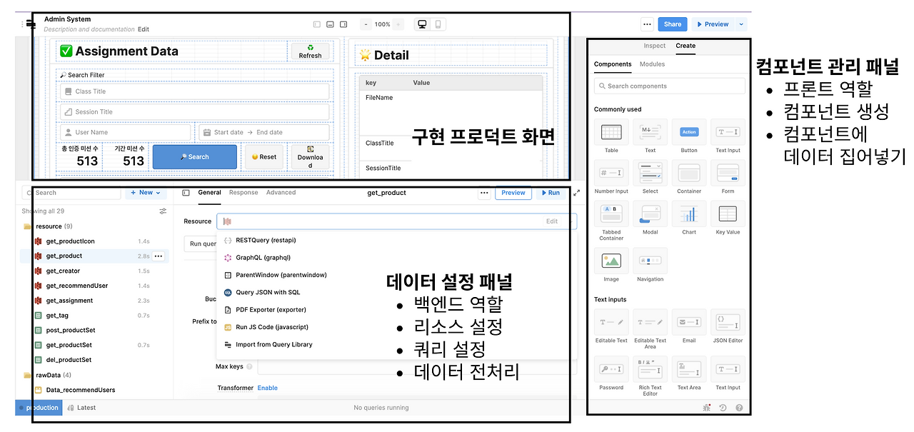 리툴은 프론트를 모르는 백엔드를 위한 툴이라 보면 된다. (1) UI를 드래그 앤 드랍으로 쉽게 구현하고 (2) 서버와 연결해서 데이터를 불러와주기만 하면 된다. (2)의 요건 때문에, 리툴은 노코드 툴보다 로우 코드로 분류된다. 노 코드는 말 그대로 "개발이 전혀 필요 없는 툴"이고, 로우 코드는 "개발이 약간은 필요한 툴"로 정의할 수 있다. 버블은 코드를 입력 없이 프로덕트를 만들 수 있지만, 리툴은 데이터를 다루기 위해서 JavaScript와 SQL을 알아야 한다. JS와 SQL을 써본 적이 없어도 걱정하지 말자! 생각보다 엄청 복잡하고 어려운 코드가 사용되는 건 아니다. 이에 대한 부분은 계속 글을 읽어보면 납득할 수 있다.