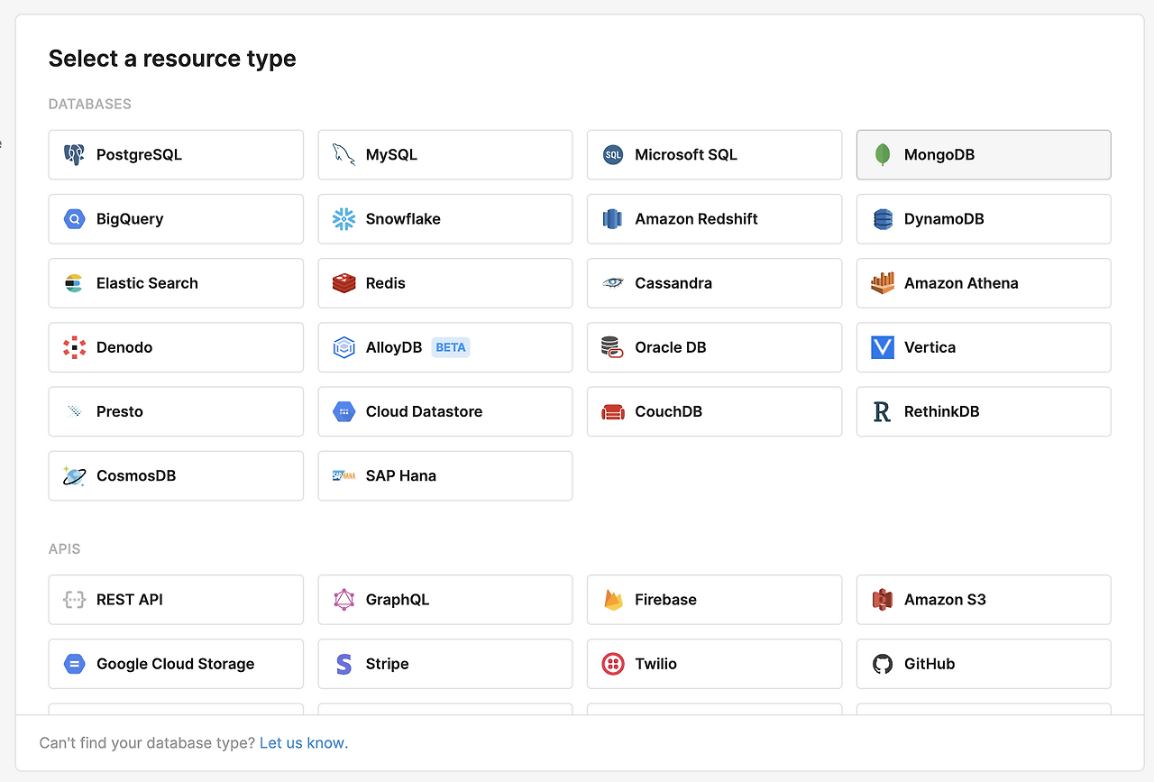 개발이라면 호출 코드를 입력해야 하지만, 다행히 외부 서버와 연동이 잘 돼있어서 인증키만 설정하면 된다. 미션 어드민 페이지를 만들기 위해 S3의 데이터를 불러와야 하므로, 데이터 리소스로 S3를 등록했다. 리소스 설정 페이지에서 새로운 리소스를 추가하면, 어떤 서버와 연결할지 아래처럼 선택할 수 있다.