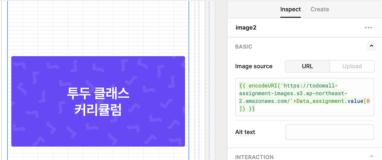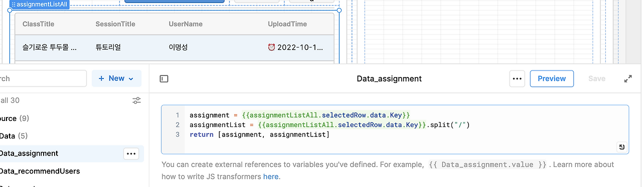 앞서 생성한 테이블만으로 미션 사진을 보기 힘듦으로, 테이블에 클릭한 행의 미션 사진을 볼 수 있게 설정해줘야 한다. JS transformer을 생성하고, {{}}를 활용해 방금 생성한 테이블의 데이터를 불러와주면 된다. 아래 이미지를 보면 {{assignmentListAll.selectRow.data.key}}라고 적혀있는데, 이는 "assignmentListAll"이란 테이블에서 "선택한 행"의 "데이터" 중에서 "key" 속성값을 불러온다는 의미다.