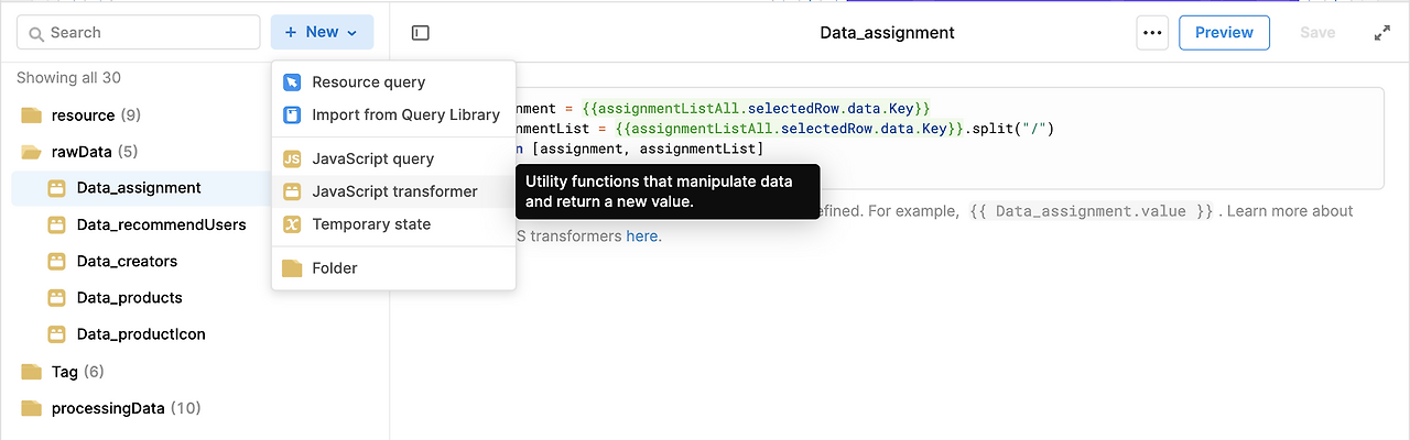 앞선 방식은 테이블에 데이터를 호출한 후에 전처리를 진행한 거고, 아예 데이터를 전처리한 후에 테이블에 호출하는 방식도 있다. 이런 경우는 JS 코드가 더 많이 사용되지만, 코드 난이도는 큰 차이가 없다. 데이터 설정 패널에서 [JavaScript transformer]을 생성하면, 리툴에서 저장된 변수값을 활용해서 새로운 값을 만드는 JS 코드를 입력해서 가동할 수 있다.